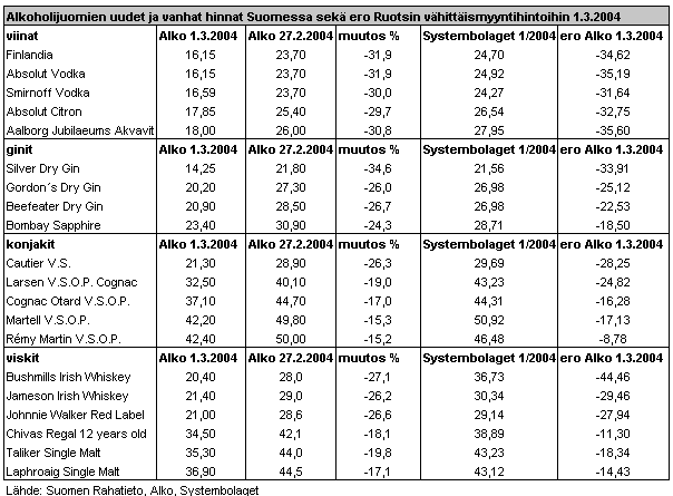 alkoholihintojen eduksi selkeästi. Ohessa on väkevistä juomista