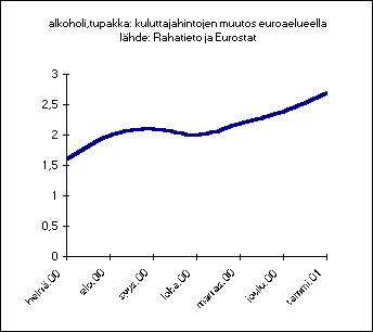 Euroalueella kuluttajahinnat näyttäisivät alkoholin ja tupakkatuotteiden osalta nousseen syksystä 2000. Tämä on linjassa hintaseurannan hintojen muutoksen kanssa.
