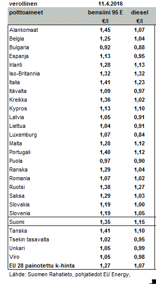 Polttoaineiden keskihinnat 11.4.2016 EU-maissa.