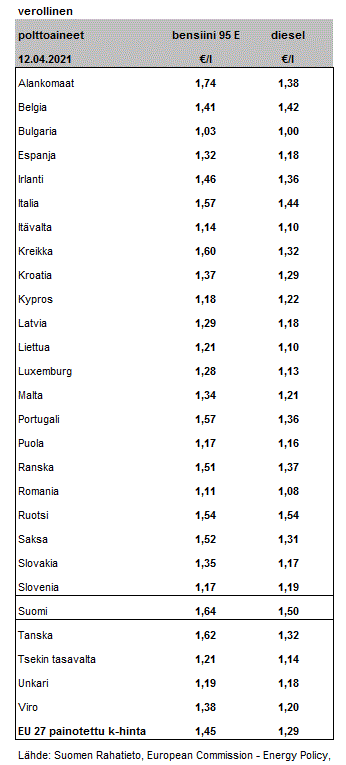 Polttoaineiden keskihinnat 12.4.2021 EU-maissa.