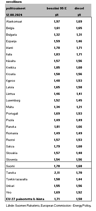 Polttoaineiden verolliset hinnat elokuussa 2024 EU:n jäsenvaltioissa