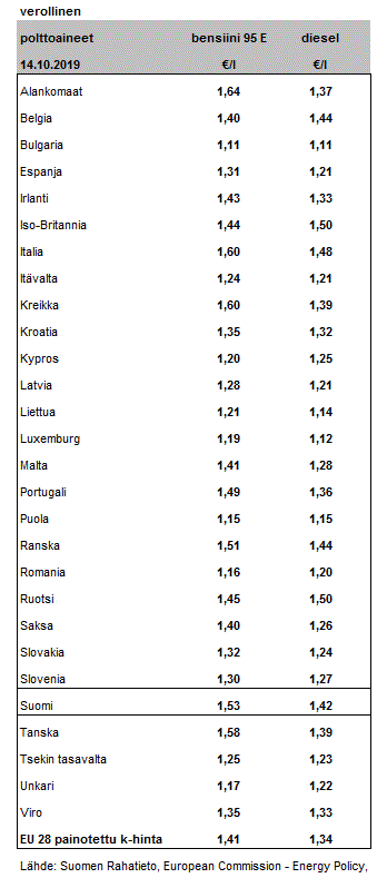 Polttoaineiden keskihinnat 14.10.2019 EU-maissa.