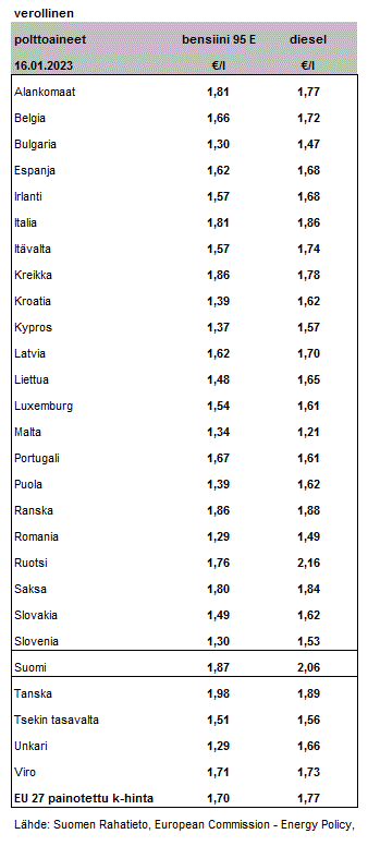 Polttoaineiden keskihinnat 16.1.2023 EU-maissa.
