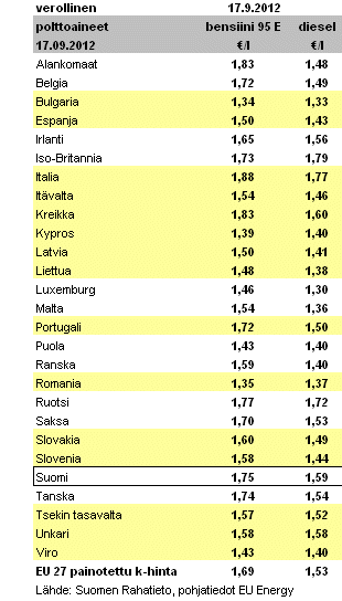 17. syyskuussa 2012. Suomessa 95 E maksoi keskimäärin 1,75 €/l.