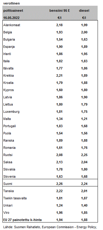 Polttoaineiden keskihinnat 18.7.2022 EU-maissa.