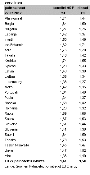 helmikuussa 2012. Suomessa 95 E maksoi keskimäärin 1,64 €/l.