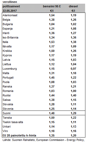 Polttoaineiden keskihinnat 22.5.2017 EU-maissa.