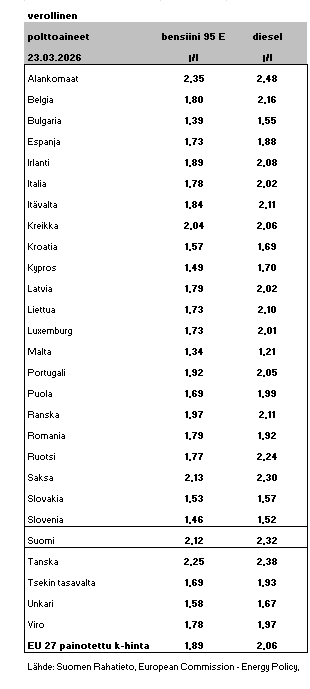 Polttoaineiden verolliset hinnat maaliskuussa 2026 EU:n jäsenvaltioissa