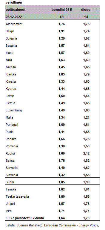Polttoaineiden keskihinnat 26.12.2022 EU-maissa.