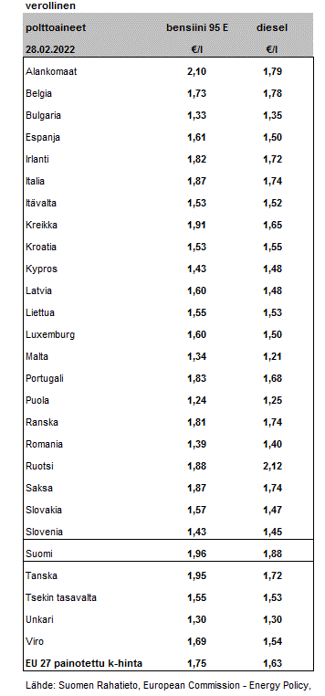 Polttoaineiden verolliset hinnat helmikuussa 2022 EU:n jäsenvaltioissa