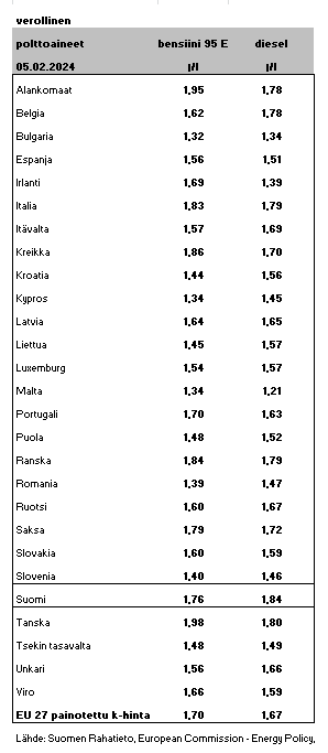 Polttoaineiden keskihinnat 5.2.2024 EU-maissa.