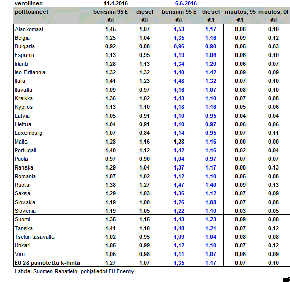 Polttoaineiden keskihinnat 6.6.2016 ja 11.4.2016 EU-maissa.