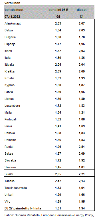 Polttoaineiden keskihinnat 7.11.2022 EU-maissa.