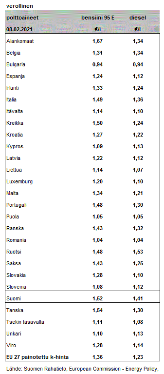 Polttoaineiden keskihinnat 8.2.2021 EU-maissa.