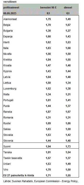 Polttoaineiden keskihinnat 8.5.2023 EU-maissa.