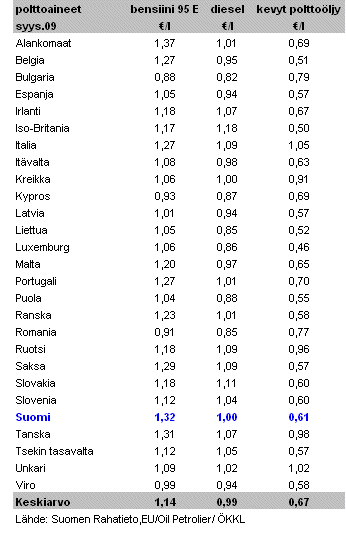 syyskuussa 2009. Suomessa 95 E maksoi keskimäärin 1,32 €/l.