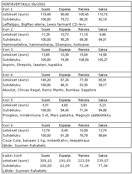 Hintaesimerkit kertovat kuluttajahintojen eroista kesäkuussa 2002 suurissa euromaissa ja Suomessa