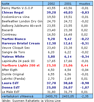 sekä parfyymejä. Eniten kallistunut oli tupakan hinta. Alentuneita