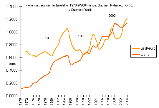 dollarin ja bensiinin hintakehitys 1970-2004
