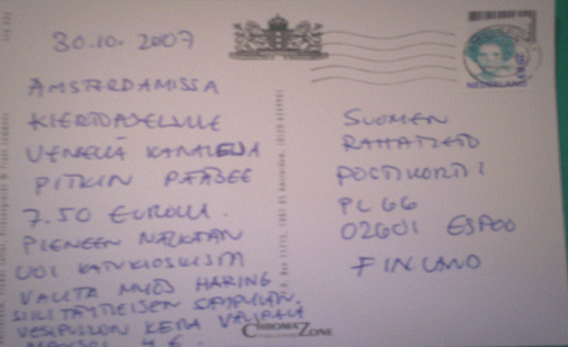 Pannukakut kinkulla ja herkkusienillä maksoi 7,95 € ja kuppi maitokahvia 1,90 €. Postikortti tupakkakaupassa