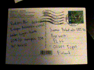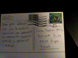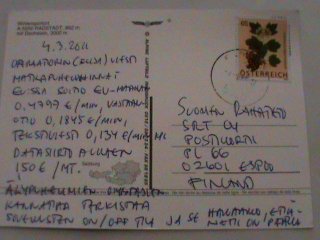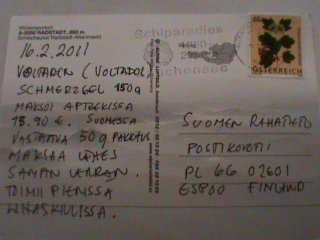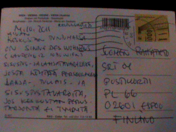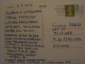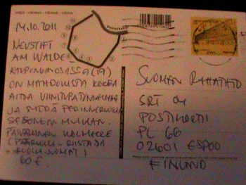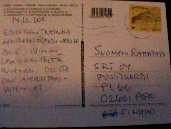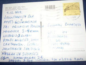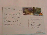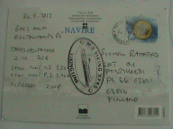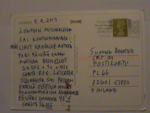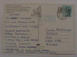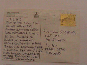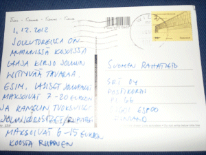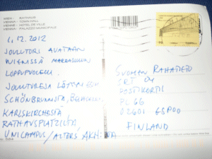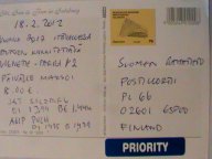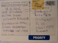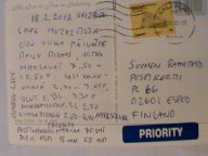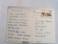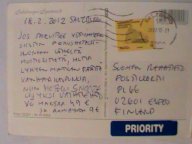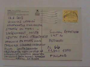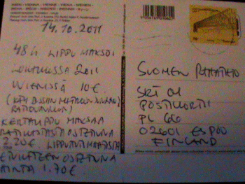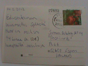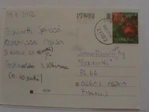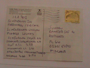 12 postimerkkiä maksoi postista ostettuna 9,96 € ja 12 postikorttia katukioskista maksoi 4 €.(4.4.2014) |