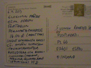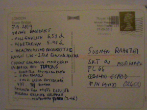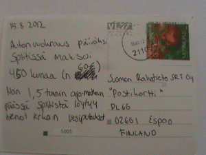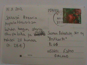 Postikortti Splitissä maksoi 3 kunaa (n. 40 senttiä) ja postimerkki maksoi 3,10 kunaa (noin 40 senttiä).