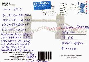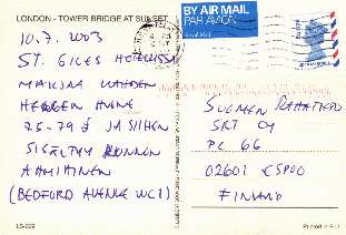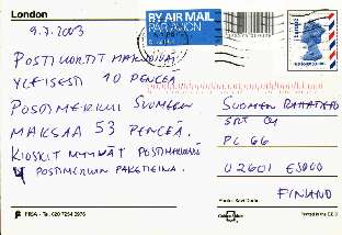 Postikortit maksoivat yleisesti 10 penceä. Postimerkki Suomeen maksaa 53 penceä.