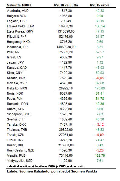 kesäkuuhun. Taulukossa näkyy valuutat ilmoitettuna