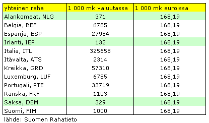 Espanjalaisille, italialaisille, kreikkalaisille ja portugalilaisille oman valuutan vaihtuminen euroiksi on valtava muutos, sillä uusi yhteinen raha on aivan eri suuruusluokkaa. Kun nyt 1 000 markkaa on 27 984 pesetaa, niin euroina summa kutistuu 168 euroon. Italialaisille muutos on kaikista suurin eli 1 000 markkaa on nyt 325 659 liiraa ja euroina siis 168 euroa.